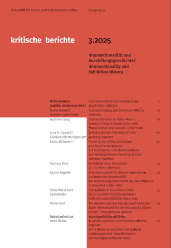 Das Heft knüpft an die Konjunkturen des Intersektionalitätsbegriffs an und fragt, inwiefern dieser als sozialhistorisch fundiertes Konzept nicht nur gegenwartsbezogen verstanden, sondern auch rückblickend auf Kunstausstellungen angewendet werden kann – als ein produktives Werkzeug der Ausstellungsgeschichte. Intersektionalität bezeichnet im Ausstellungsmodus sowohl das Zusammenwirken verschiedener Diskriminierungsformen als auch Strategien zu deren Sichtbarmachung und Überwindung. Kann deren Berücksichtigung in der Analyse etablierte Ausstellungsgeschichten infrage stellen und zugleich der Tendenz zur Partikularisierung dieses kunsthistorischen Arbeitsbereichs entlang singulärer Identifikationskategorien entgegenwirken?